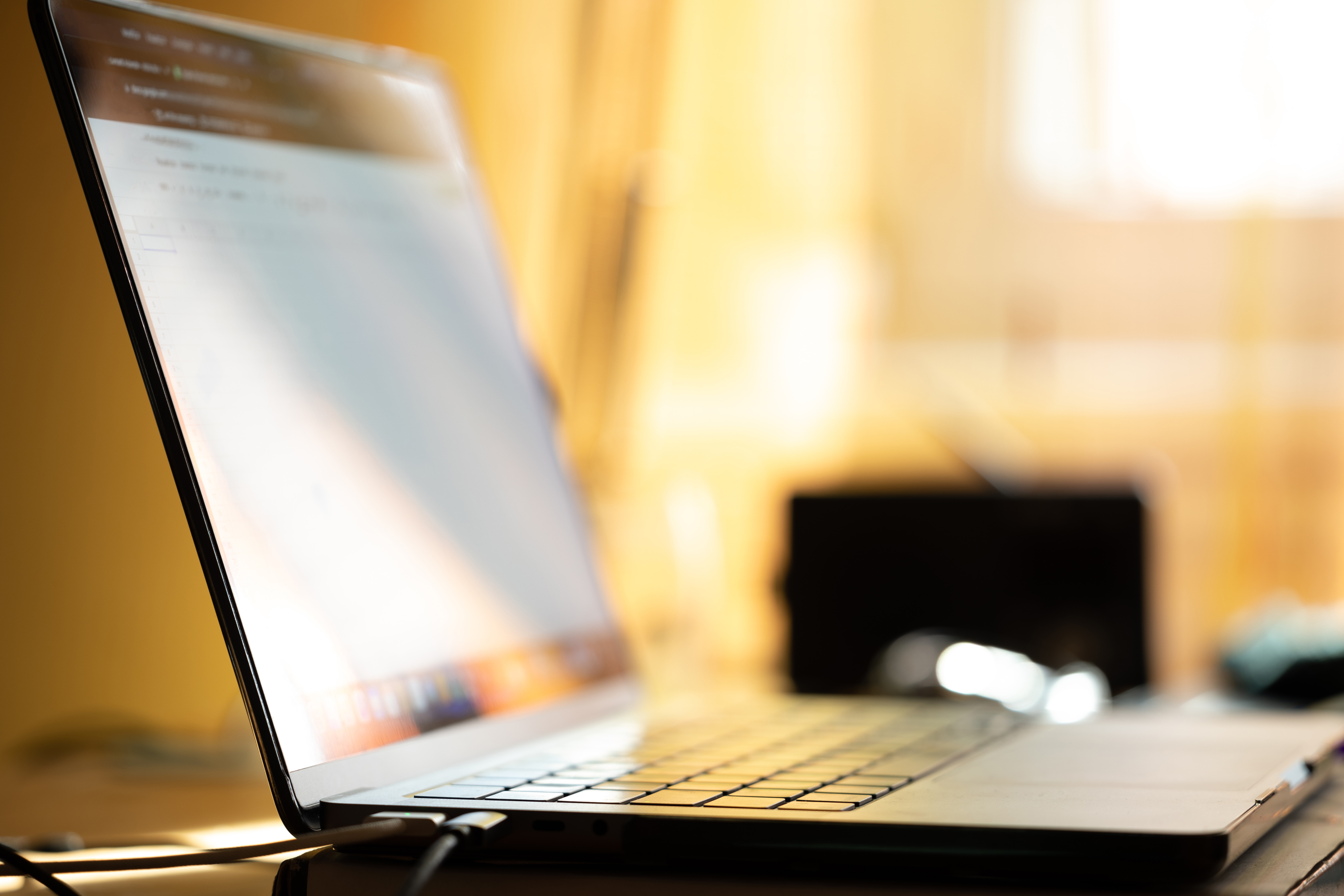 close up view of a portable computer, placed on a desk. bright, colorful and blurred background